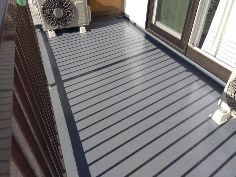 下地完成後、新たにFRP防水を施工しました。FRP防水は、継ぎ目のない一体構造となるため、防水性が高く、バルコニーや屋上などの平らな場所に適した工法です。平面部分だけでなく、立ち上がり部分まで一体で施工することで、防水上の弱点となりやすい接合部もなくしています。